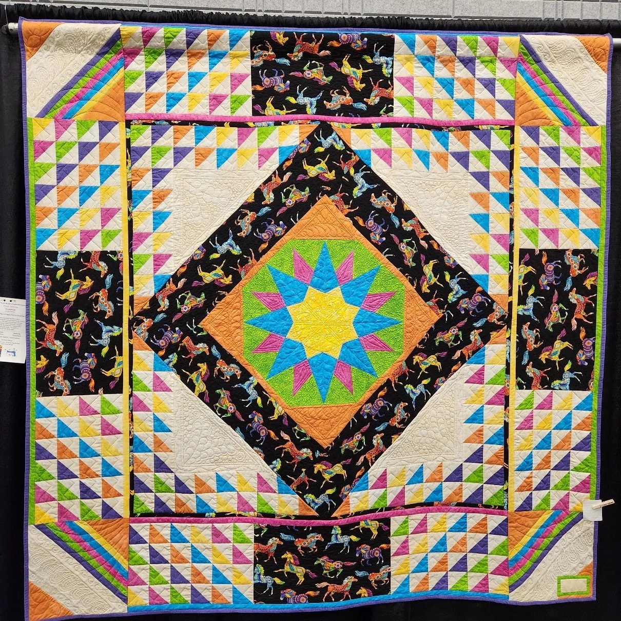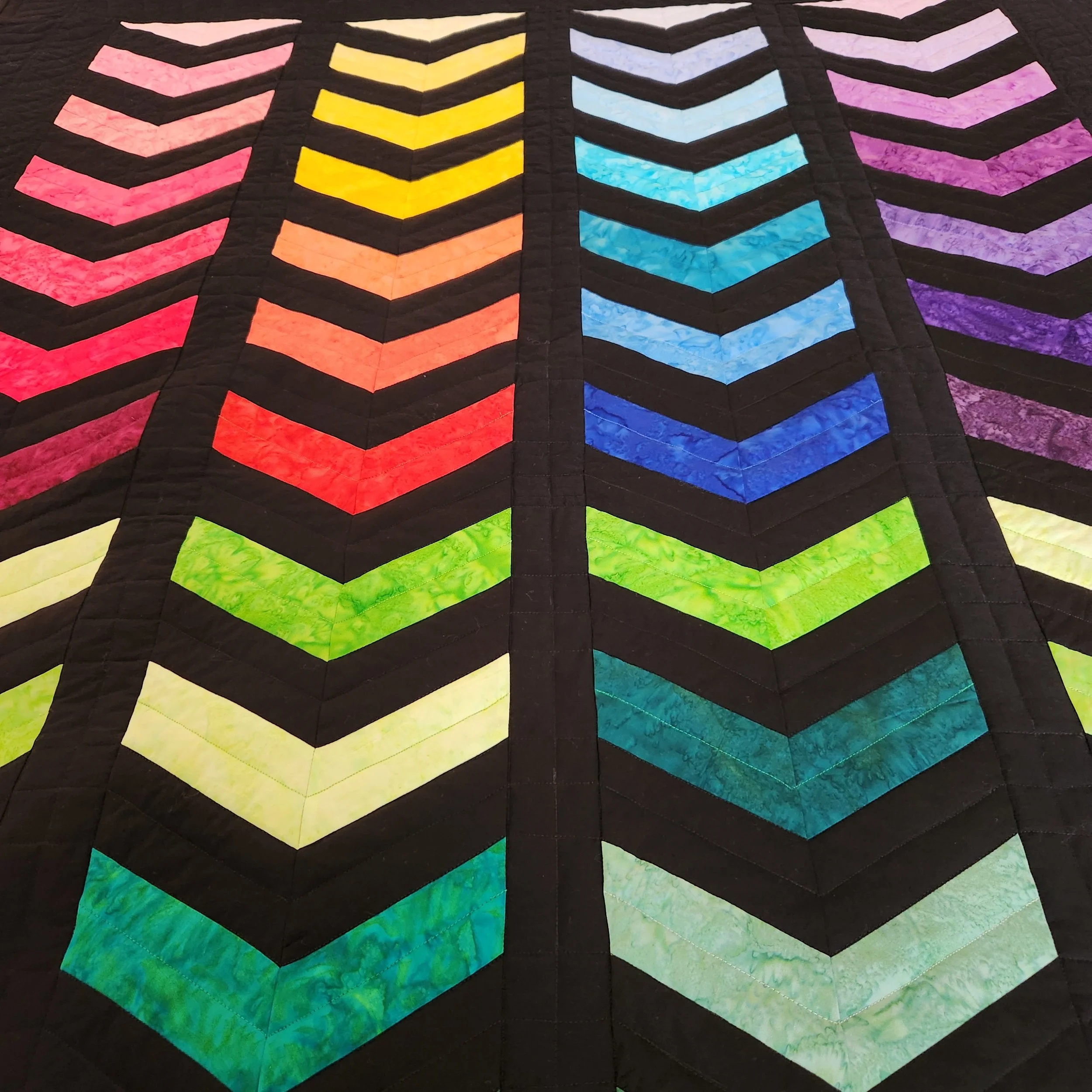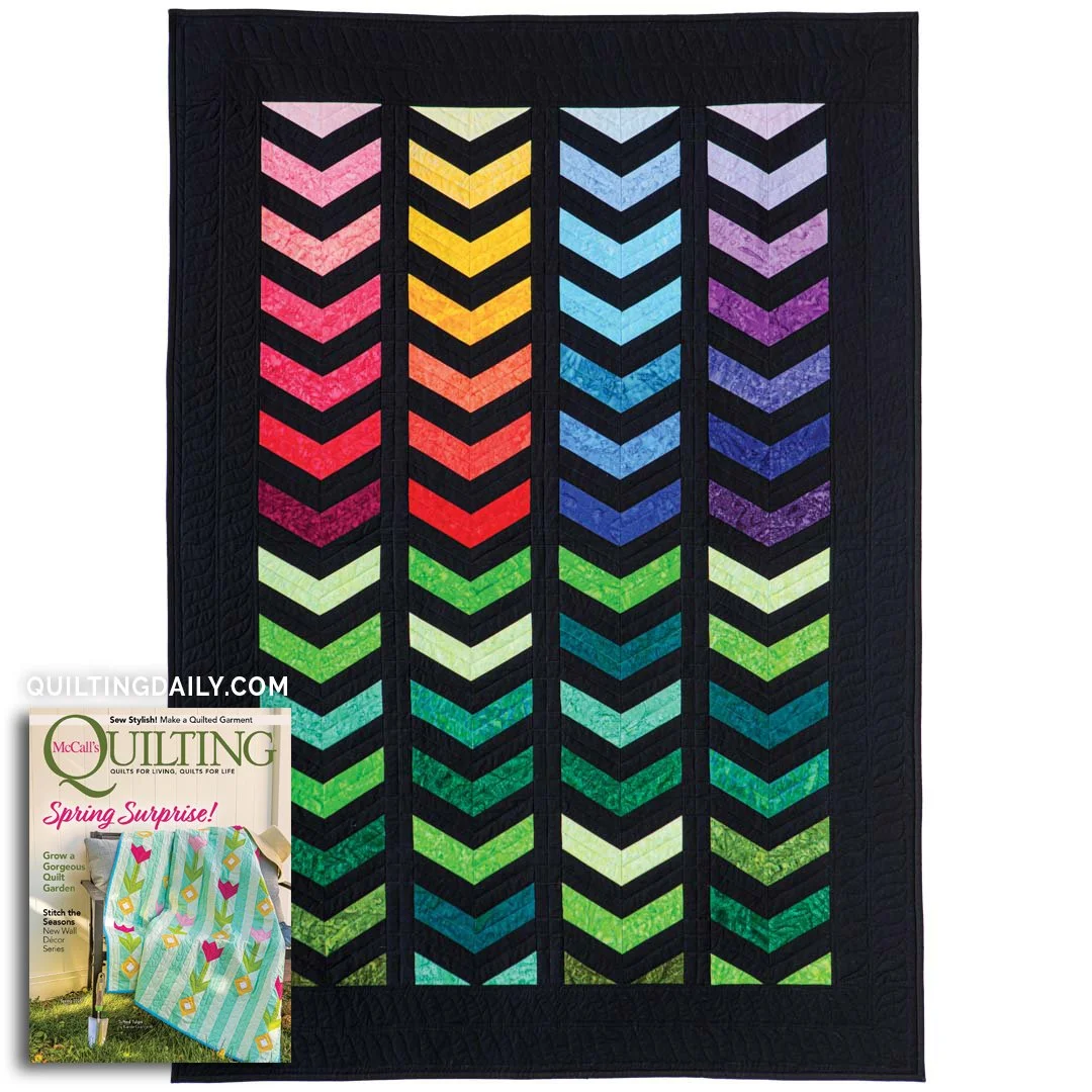 An abstract design of columns of flower petals and green leaves is created from a single pattern piece - a parallelogram! It’s the selection of vibrant colors popping against a black background that brings the design to life!