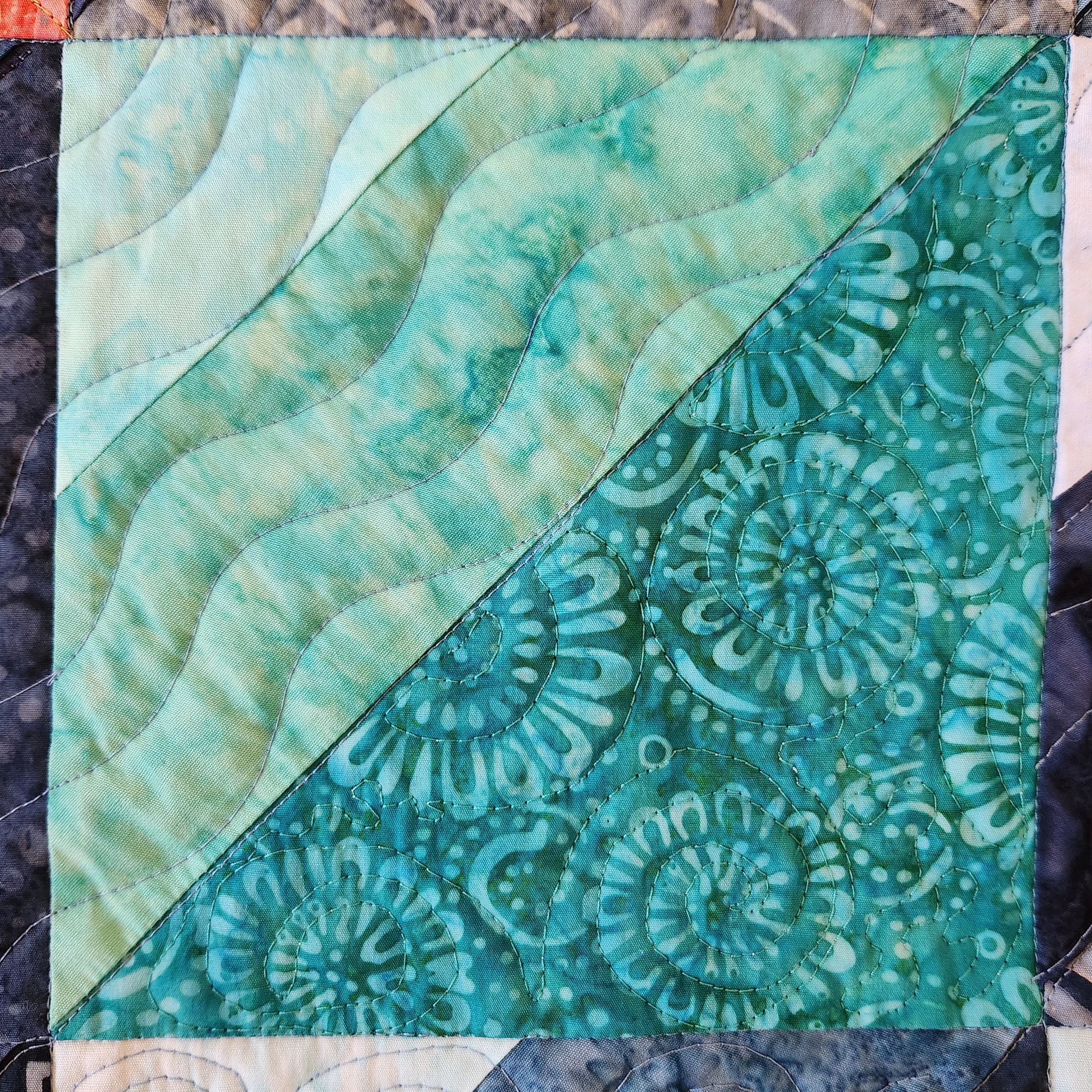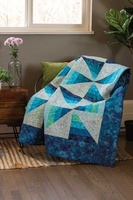 Create a lightweight throw quilt for summer featuring swirling fans in cooling teals and blues! Precut “jelly roll” strips are pieced quickly into sets. Half-square triangle techniques finish forming the fan blades. Free-motion swirls add to the fan theme of keeping cool in the summer!