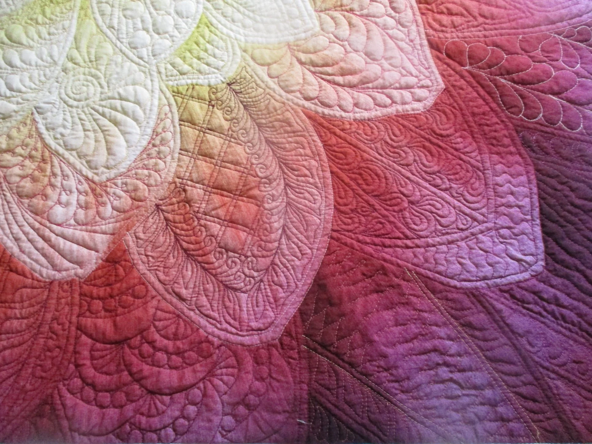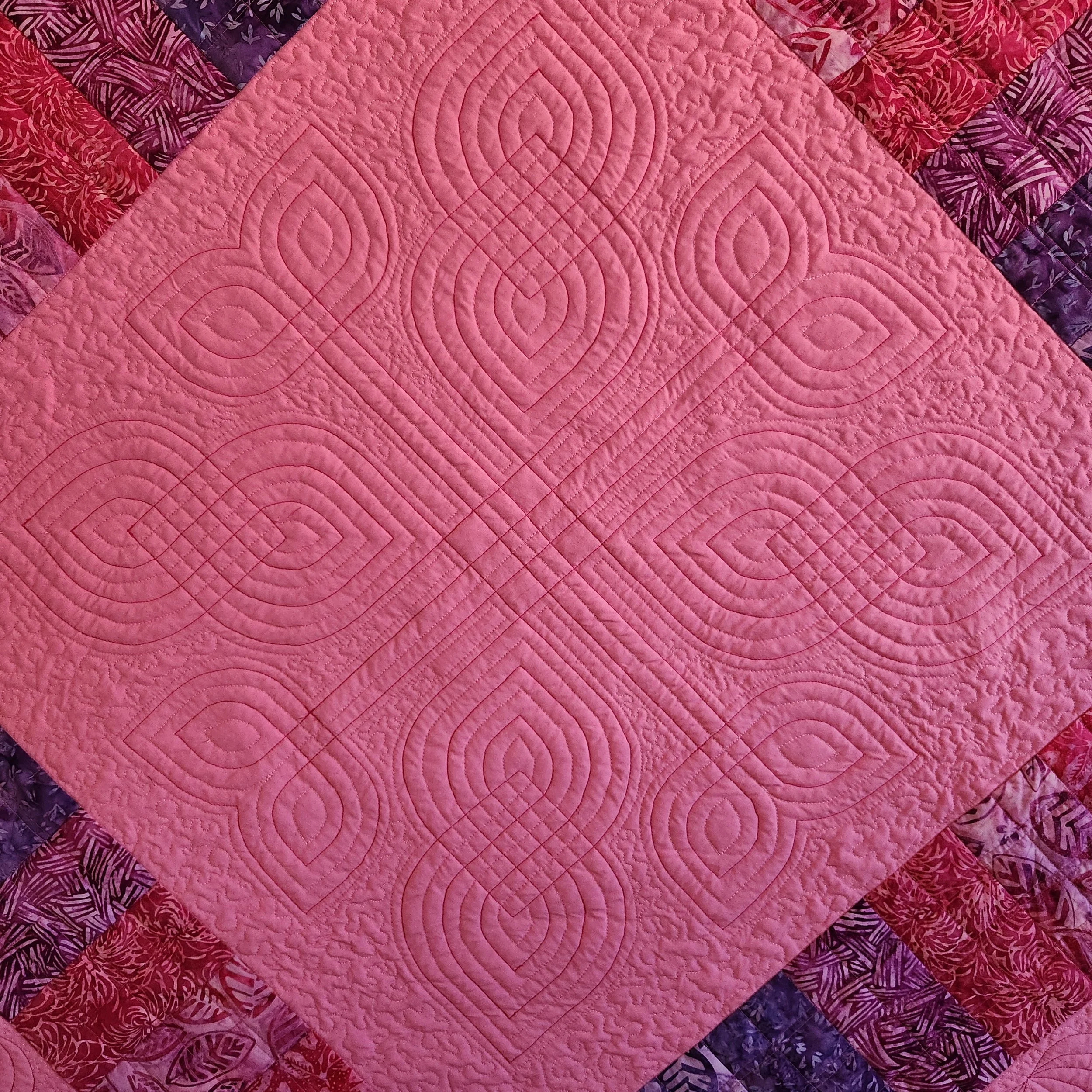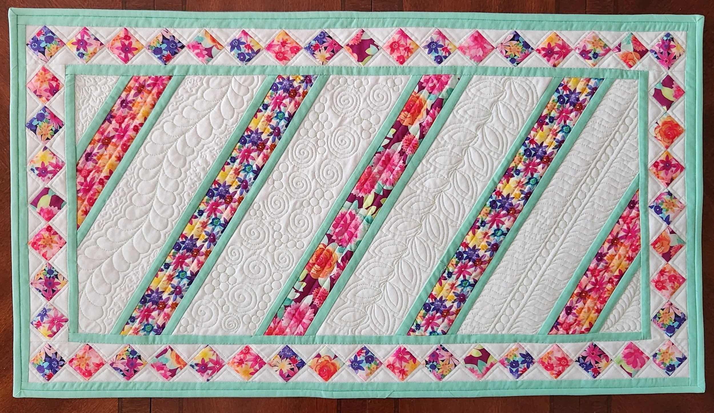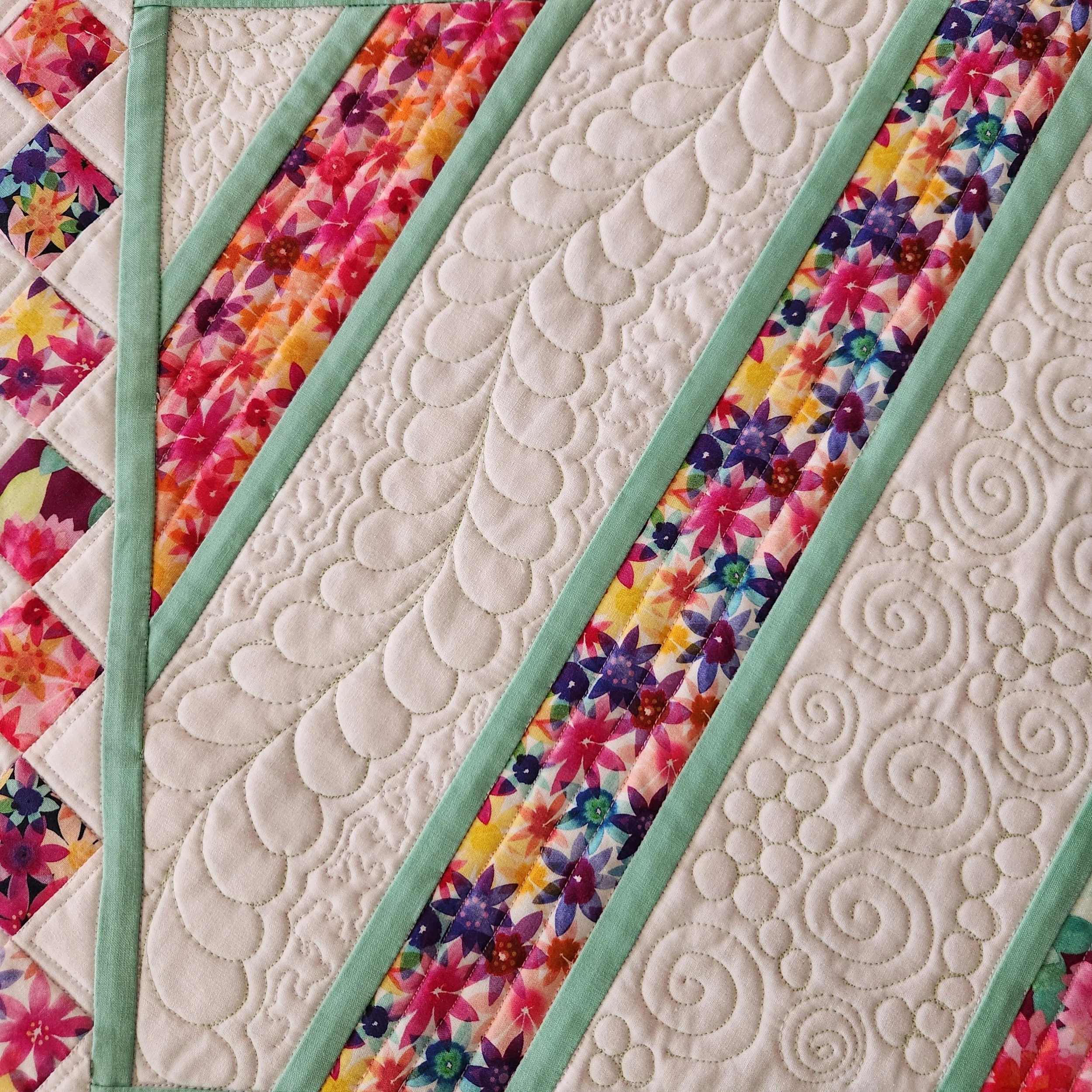 Between the rows of floral fabrics are intricate free-motion quilted motifs echoing the grace and beauty of the flowers.