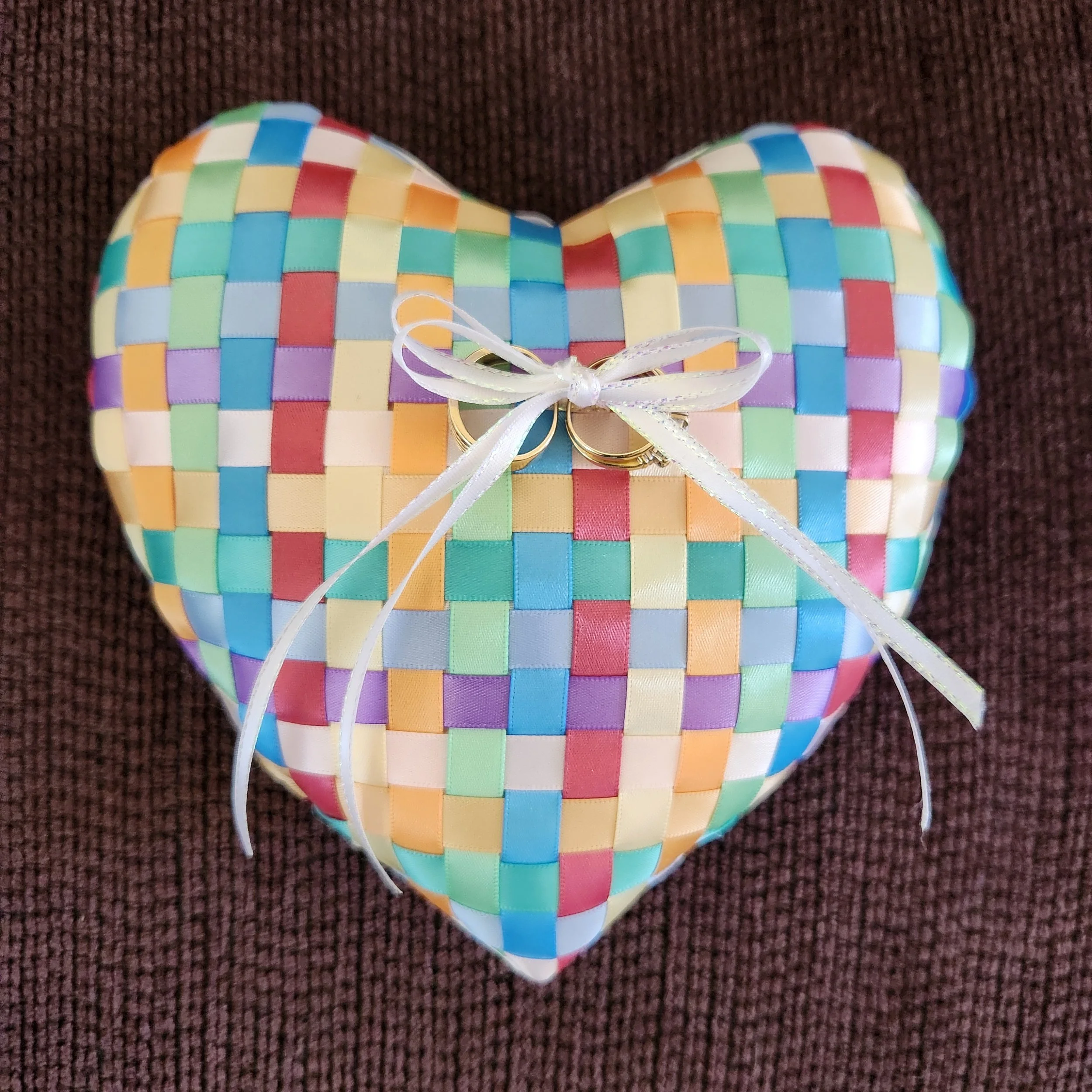 Create a special keepsake for someone’s wedding day by using ribbon weaving to make a ring-bearer pillow! Ribbons can be in the wedding colors, all-white or a variety of pastel shades as shown here.