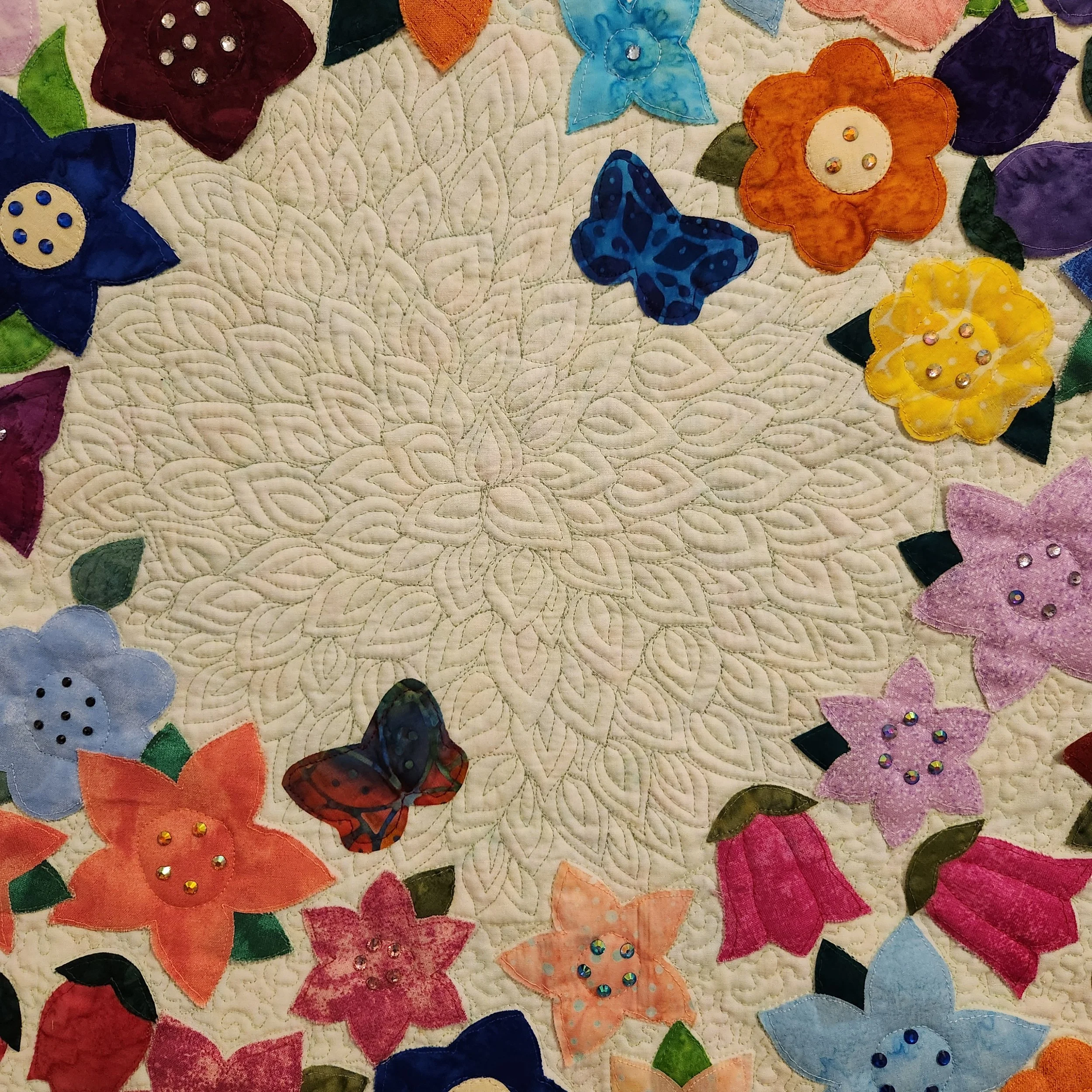 Delicate flowers and butterflies were created using raw-edge applique on a pale green background which was then quilted intensely with leaves, vines, plumes and pebbles. Colorful rhinestones enhanced the flowers, adding sparkle to the appliqued petals.