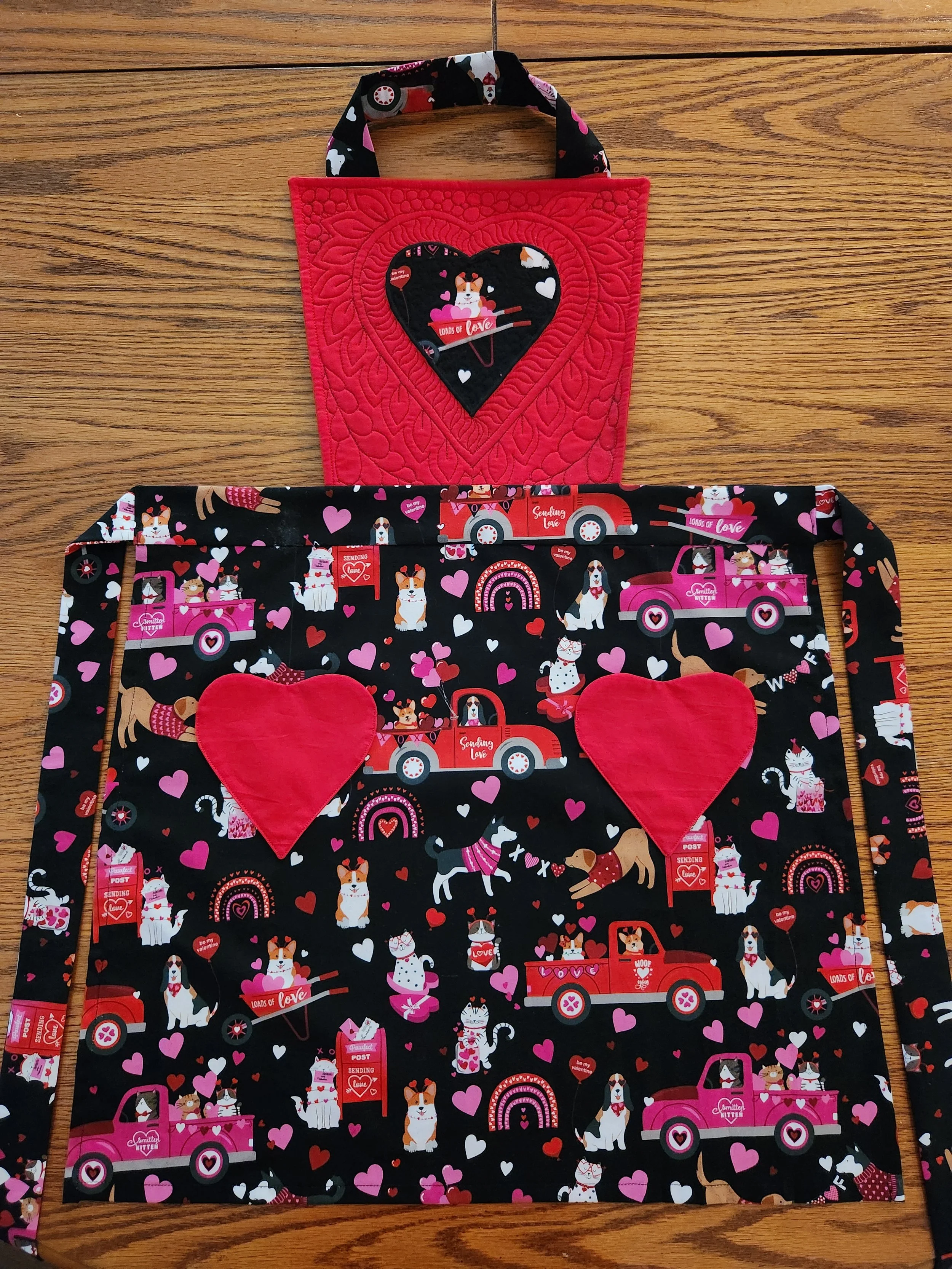 With the high cost of eating out, many couples are choosing to dine in on Valentine’s Day. This whimsical apron for Valentine’s Day features free-motion quilting on the bib and heart-shaped pockets, sure to add a fun twist to preparing a special meal!