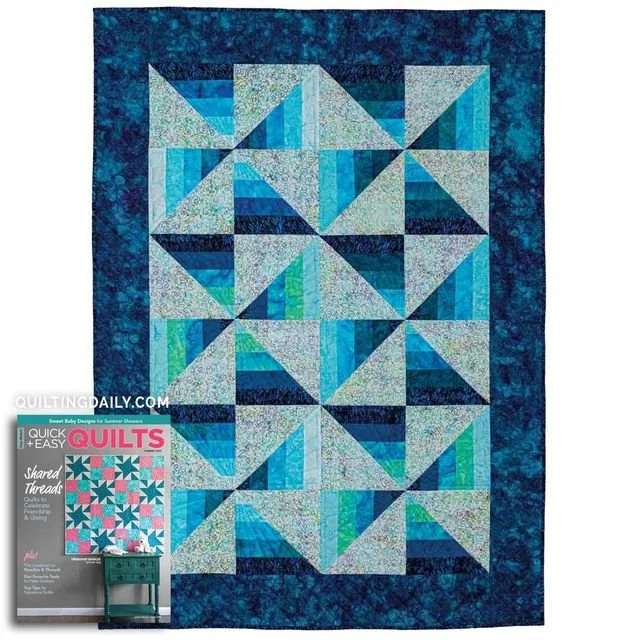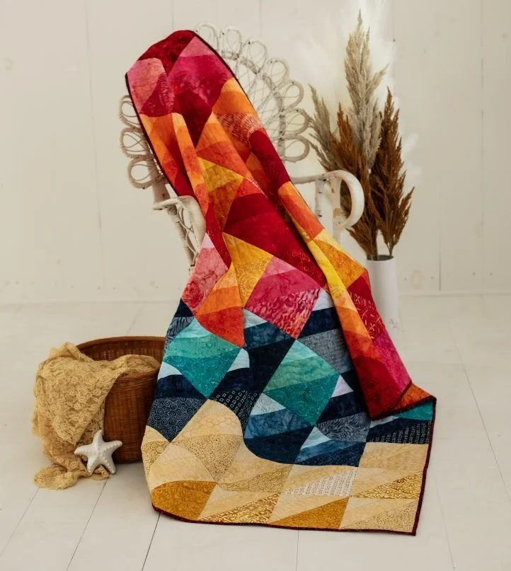 Portraying the warmth of the summer sun glistening on cool ocean waves lapping up on a golden beach, this throw quilt can be made from scrap fabrics or precut batik squares.