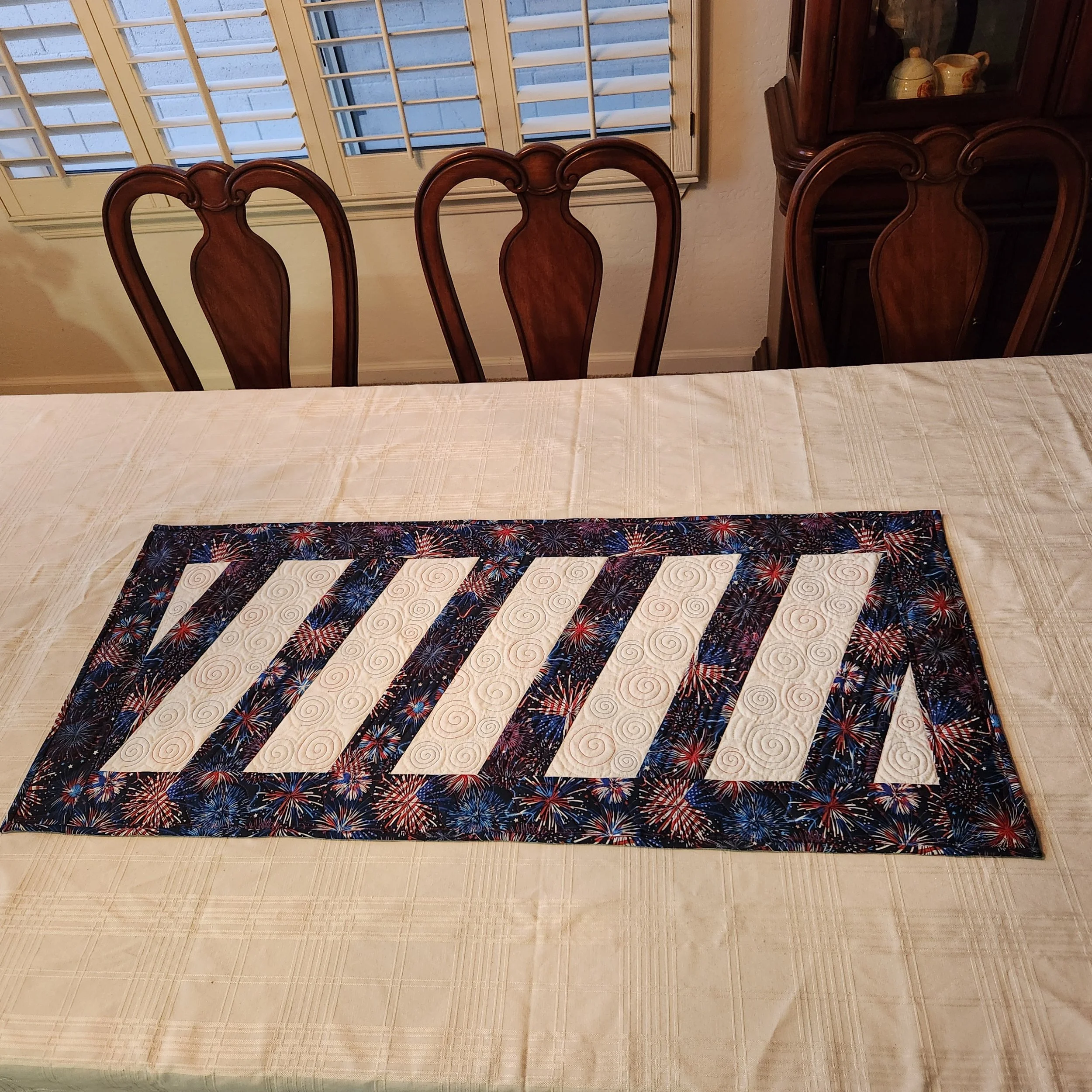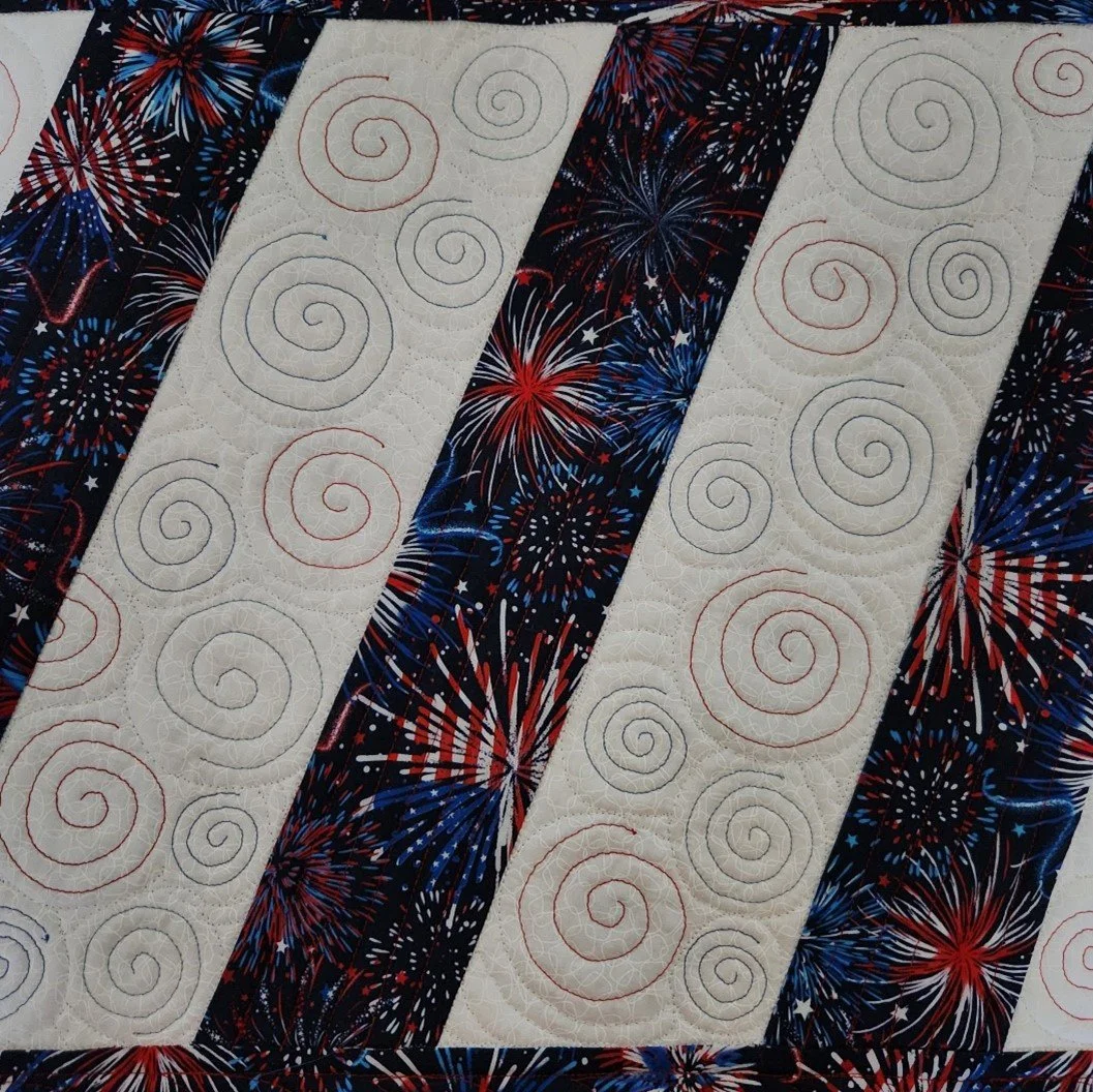 This red, white and blue runner adds a festive touch to a 4th of July celebration! Made with just two fabrics and free-motion quilted swirls, it goes together relatively quickly and could make a nice hostess gift.