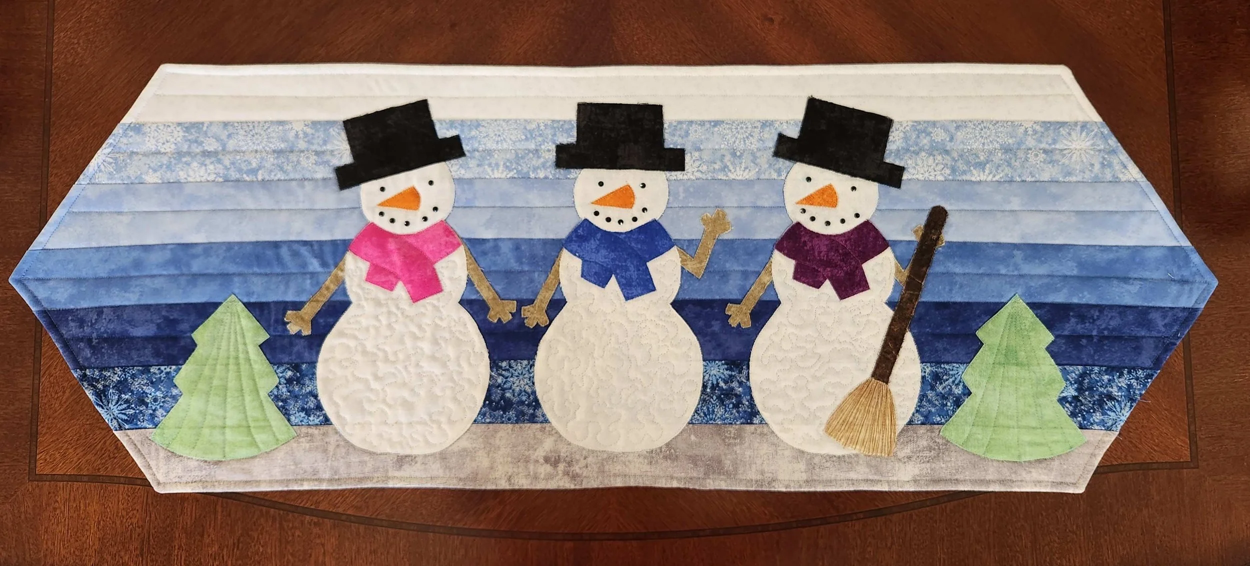 The snowmen made from raw-edge applique have brightly colored scarves and carrot noses, warming up a winter table.