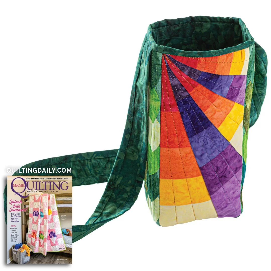 This colorful water bottle holder with Insul Bright batting keeps beverages cold during summer hikes and picnics. The front of the holder features foundation-pieced sun-rays and shade while the back has cool ocean water under a pastel summer sky. Appliqued leaves adorn both sides of the bottle.