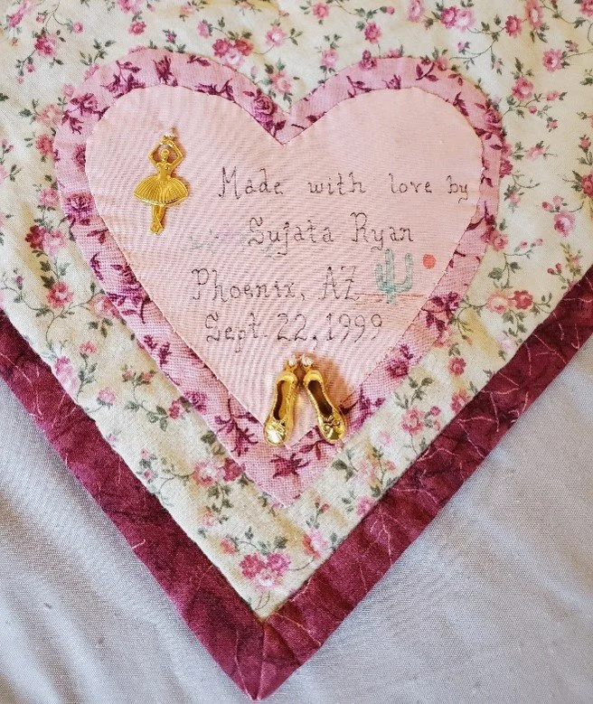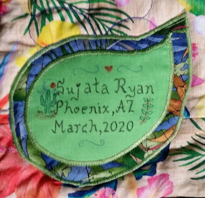 Based on intricate, geometric designs of the ancient South Indian artform, “kolam”, the quilted central design begins as a 7 x 7 grid of dots. Concentric lotus petals emerge as dots are connected symmetrically. Traditional “kantha” patchwork, another Indian artform often created by rural crafters, adorns each corner.