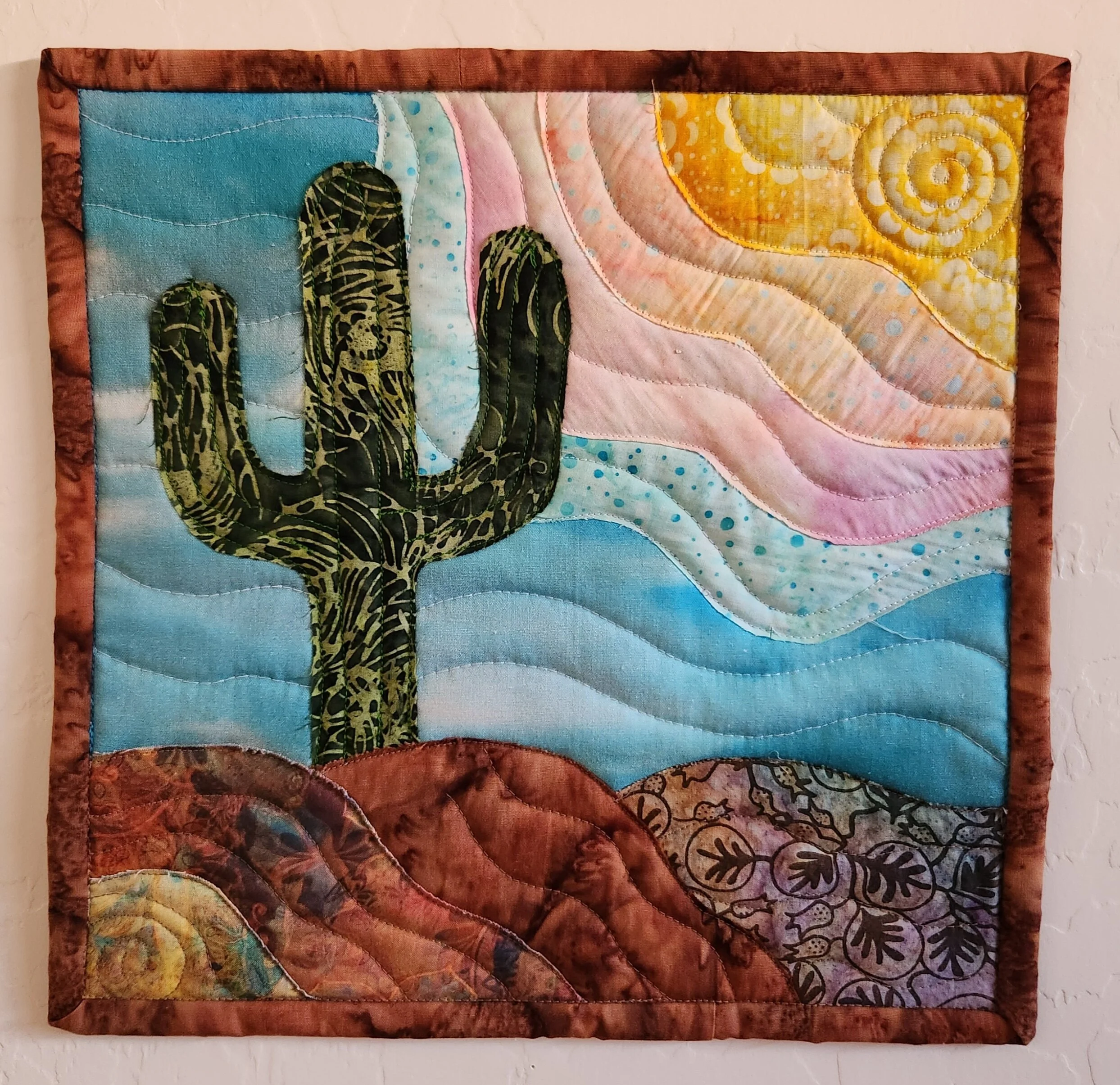 To thank you for signing up for the monthly newsletter, here is a free pattern for a raw-edge applique mini-quilt, Saguaro at Sunrise! Whether this is your first quilt or fiftieth, this 12 inch x 12 inch mini-quilt will provide a creative experience in applique!